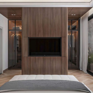 - Hệ vách TV tích hợp thông minh: Sự kết hợp giữa các mảng tường phẳng tối màu và hệ kệ mở, tạo nên một hệ thống lưu trữ tinh tế, loại bỏ hoàn toàn sự lộn xộn của các dây thiết bị điện tử.