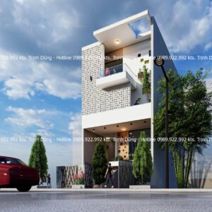 Điểm ấn tượng nhất của công trình chính là mảng **gạch bông gió trắng** chạy dọc mặt tiền từ tầng 2 lên tầng 4. Đây không chỉ là điểm nhấn mỹ thuật mà còn là giải pháp kỹ thuật thông minh: