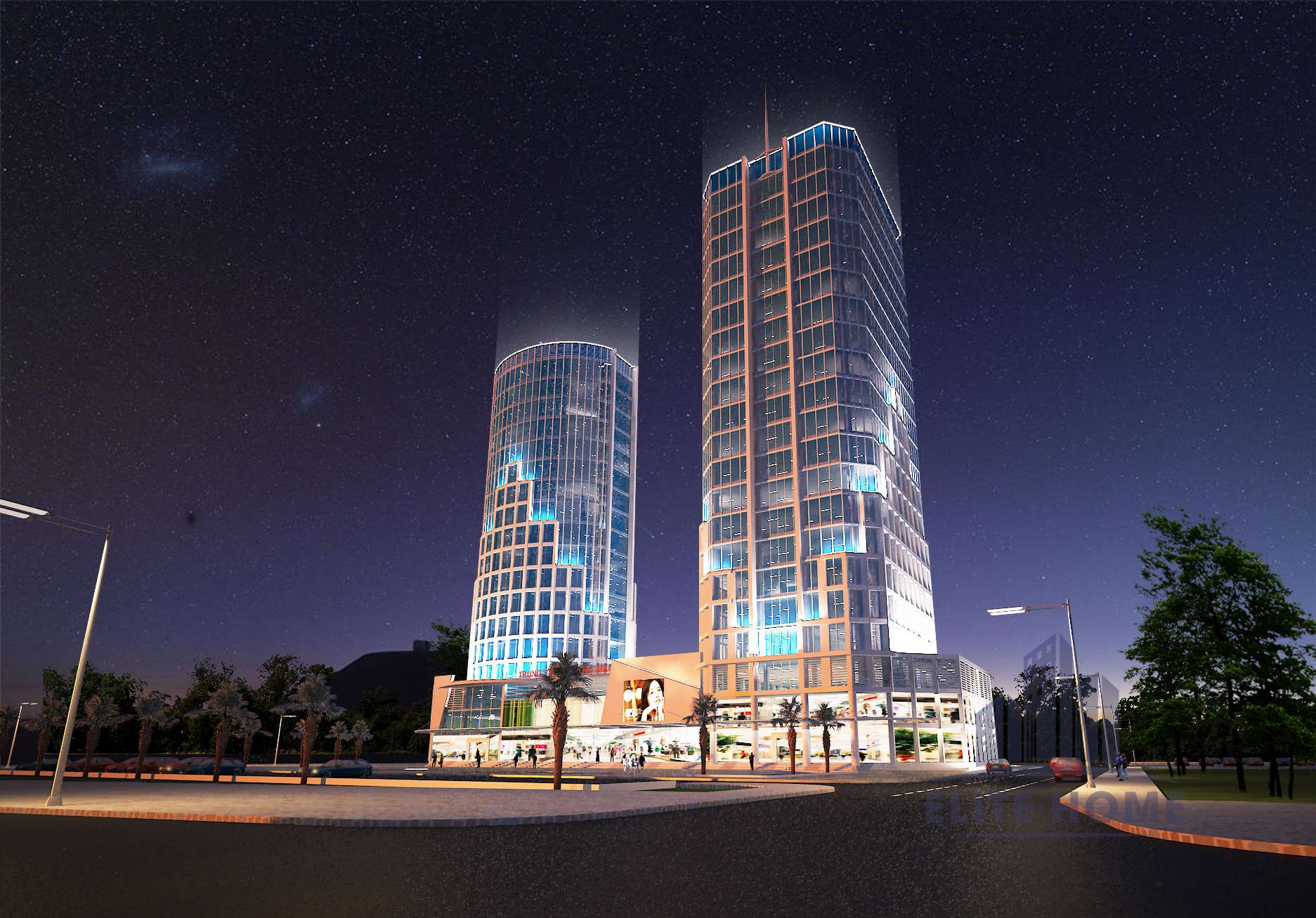 Kiến trúc sư của Elite Home đã đưa ra giải pháp tháp đôi (Twin Towers) với ngôn ngữ hình khối đầy táo bạo, tạo nên nhịp điệu kiến trúc độc đáo cho khu vực: